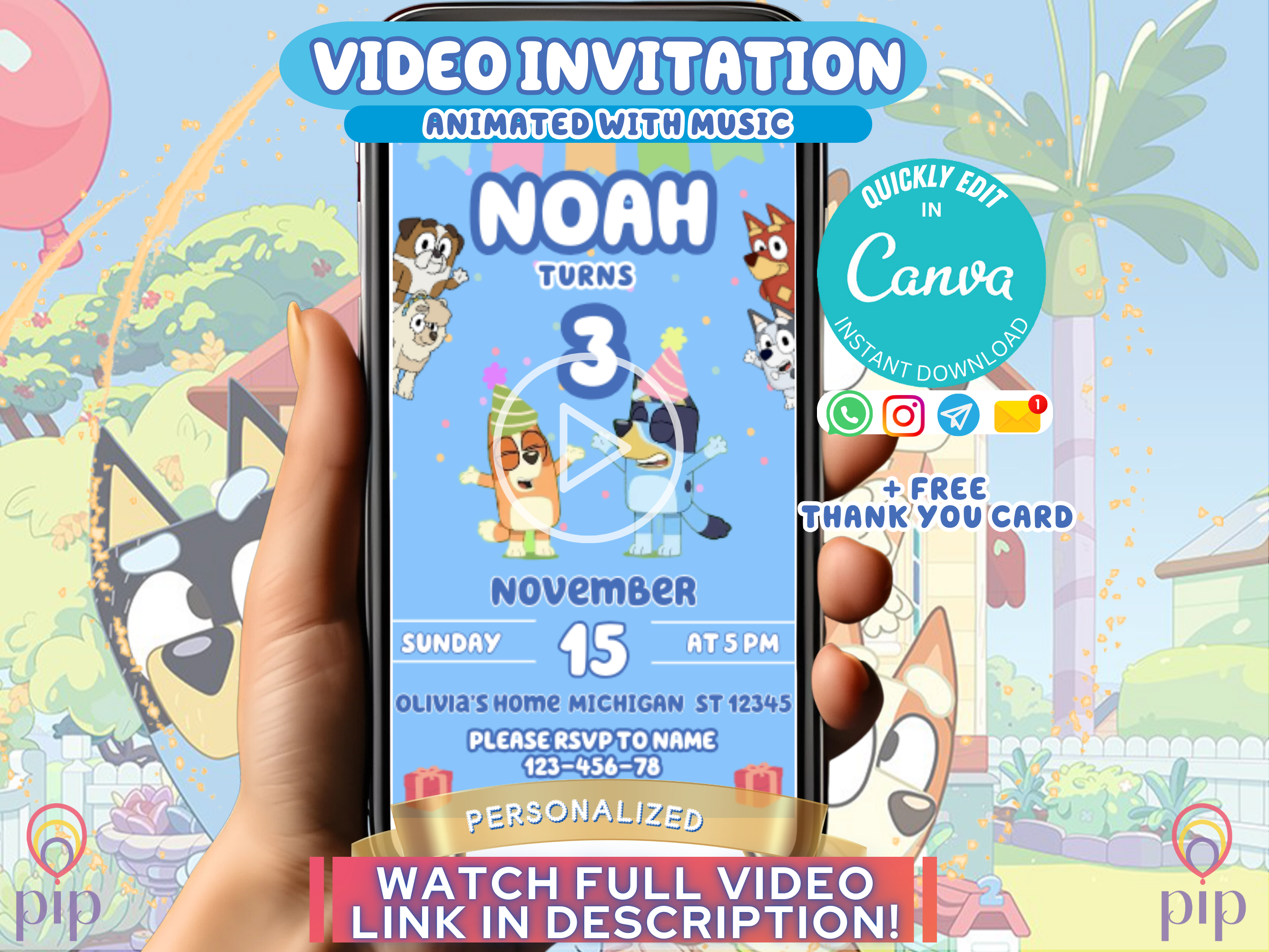 Bring the magic of Bluey to your child’s birthday with this fun, animated video invitation! Perfect for Bluey fans, this invitation features engaging animations, theme music, and customization options to make their special day even more memorable.